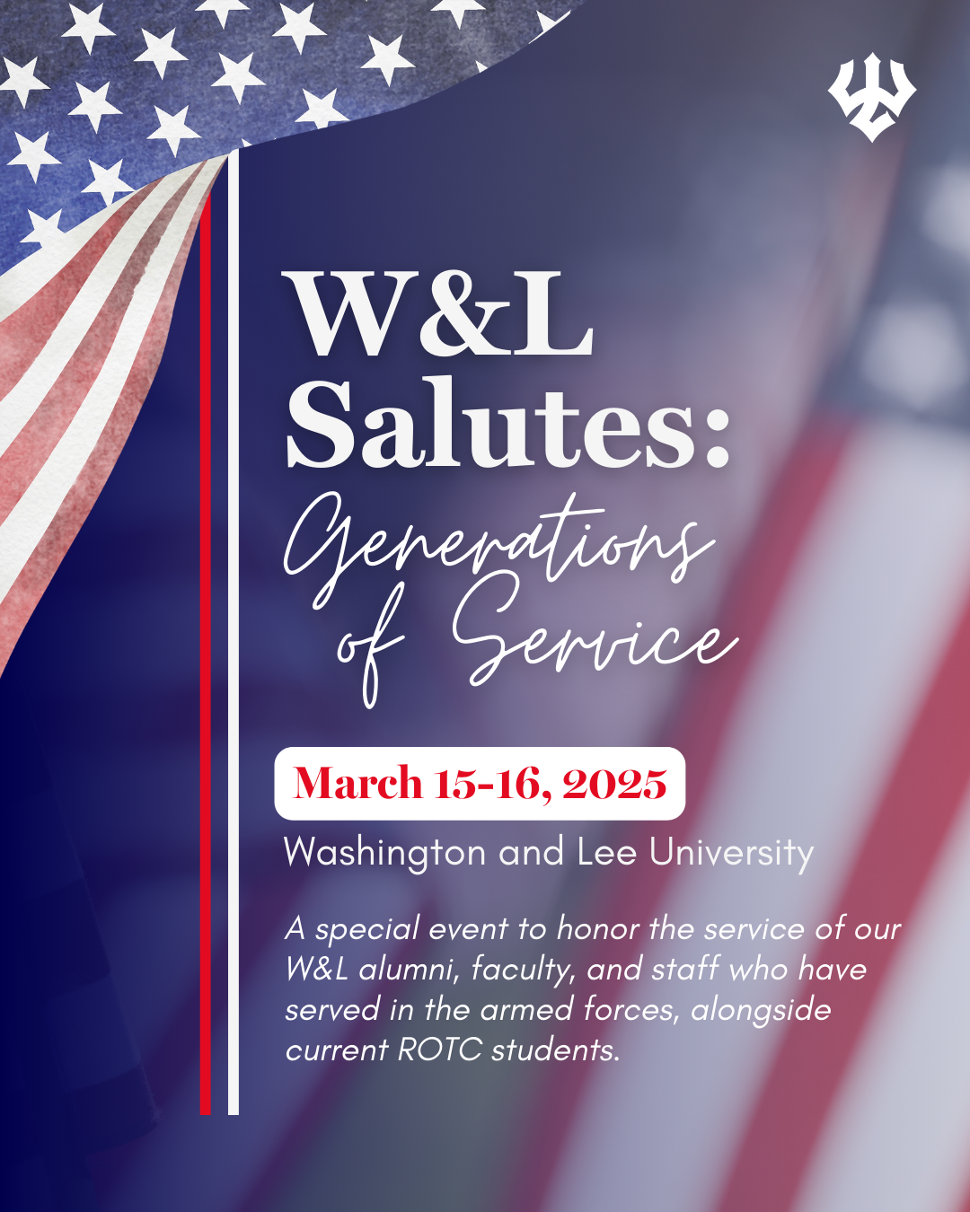 W&L Salutes: Generations of Service will take place on March 15-16, 2025. At this special event, we will honor the service of our W&L alumni, faculty, and staff who have served in the armed forces alongside current ROTC students. ⭐️Learn more at wlualumni.events/salutes